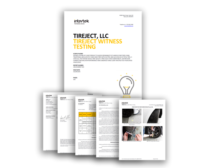 Intertek, the global leader in automotive testing, independently verified that TireJECT Liquid Tire Repair consistently seals punctures and is safe for a wide variety of tires and sensors across all passenger vehicles.